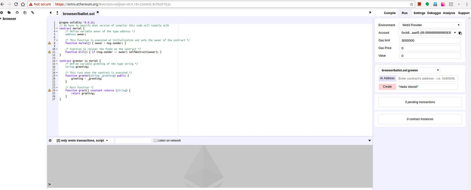 We will use the remix IDE for the ethereum smart contract( In developer language program) development. Navigate to https://remix.ethereum.org/ and allow unsafe script to load.