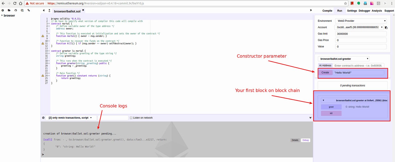 Pass the constructor parameters in create method(e.g “Hello world!”. Click on create, Wow!!! we have generated a first block. You can even call the greet method on newly created block.