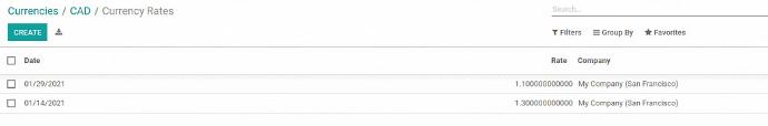 Now, changing currency rate manually to show the difference. Currency is changed to CAD 1.10 for USD 1.00. To do that, go to Configure>Currencies>Select currency>create. Add date and edit the rate.