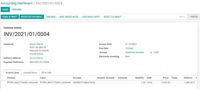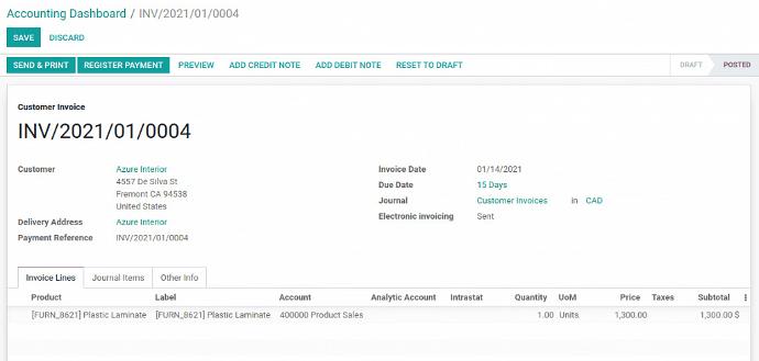 Create a new invoice. Go to Accounting dashboard and select create invoice. Select CAD first and add product. This is the order when Value of CAD is 1.3000000 for USD 1.00