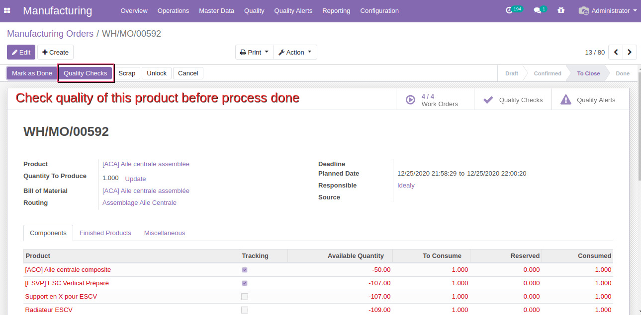 In Odoo ERP we can process quality checks in view as manufacturing or transfer.