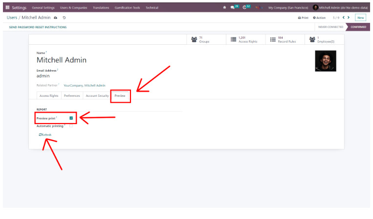 Select a particular user and access their profile. Inside the profile, navigate to the “Preview” section. Within this section, enable the “Preview print” checkbox. Subsequently, initiate the configuration update by clicking the “Refresh” button.