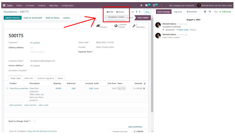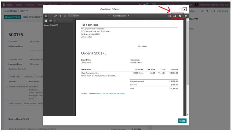 Launch the ‘Sales’ application, and choose a quotation or sales order. Click on the ‘Print’ function, and from the dropdown, select ‘Quotation/Order.’ This action allows you to preview the particular order before initiating the download.