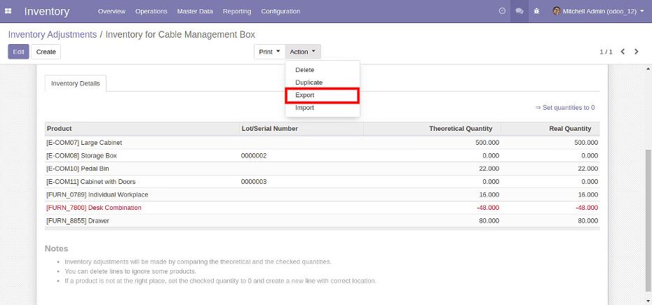 It allows us to export the product list from inventory adjustment and also Imports the CSV file again in the Inventory along with the changes.
